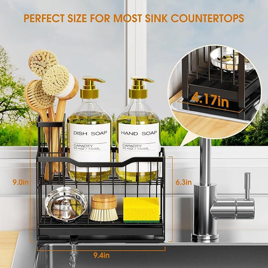 2-Tier Self-Draining Sponge Holder for Kitchen Sink - Rustproof Non-Slip Sink Caddy with Dish Brush Holder & Fits for Most Soap Dispensers - Black