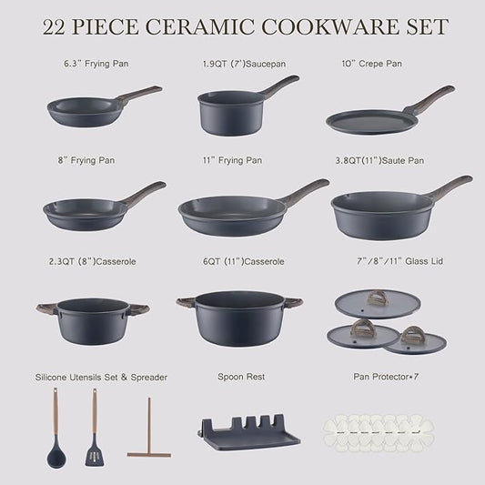 22Pcs Pots and Pans Set Non Stick Non-Toxic Ceramic Cookware Sets Nonstick Kitchen Pot and Pan Set With Lid Gray Granite Induction Compatible with Glass Lids 10" Griddles Frying Pan PFOA/PFOS-Free