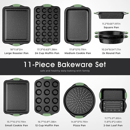 11-Piece Nonstick Bakeware Set, Stackable & Oven-Safe Kitchen Baking Pans with Silicone Handles - Includes Cookie Sheet, Cake Pan, Muffin Tin, Pizza Stone & Bread Loaf Pan, Dark Green&Black