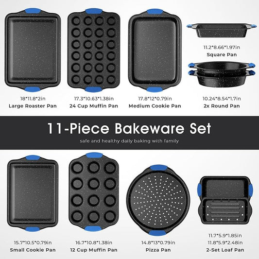11-Piece Professional Stackable Baking Set, Oven-Safe Nonstick Cookware with Cool-Touch Handles - Features Cookie Sheet, Cake Pan, Muffin Tin, Pizza Stone & Bread Loaf Pan, Black&Blue