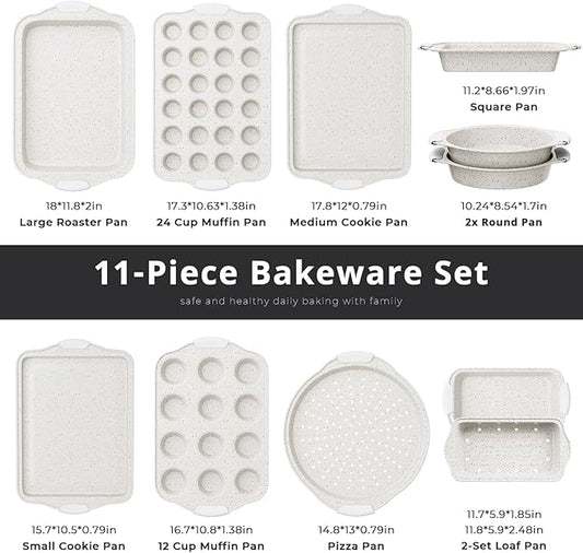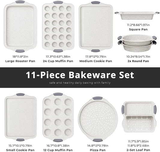 11-Piece Nonstick Baking Pans Set, Stackable Non Toxic Bakeware Sets with Cookie Sheets, Cake Pan, Loaf Pan, Pizza Pan, Muffin Pan, White&Gray
