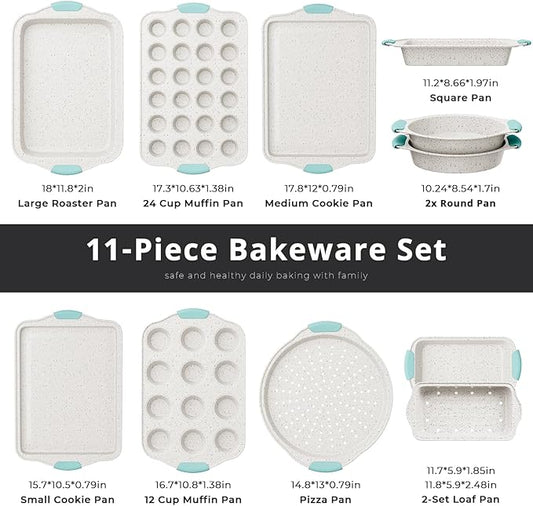 11-Piece Non-Toxic Baking Set, Stackable Nonstick Cookware with Heat-Resistant Handles - Includes Cookie Tray, Round Cake Pan, Muffin Cups, Pizza Pan & Loaf Baker, White&Light Green