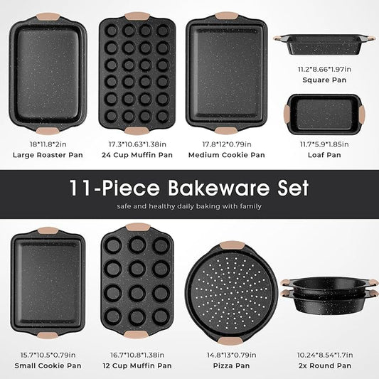 11-Piece Baking Pans Set, Nonstick Bakeware Sets, Oven Pans for Baking with Silicone Handles, Includes Cookie Sheet, Cake Pans, Loaf Pan, Pizza Pan, Muffin Pan, Khaki&Black