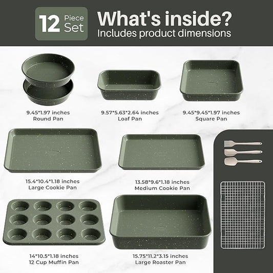 12-Piece Nonstick Baking Set, Non-Toxic Bakeware Sets with Baking Sheet, Cake Pan, Square Pan, Loaf Pan, Roasting Pan, Muffin Pan, Cookie Sheet, Cooling Rack & Kitchen Utensilss - Ceramic Coated Green