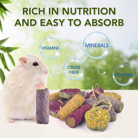 12PCS Rabbit Chew Sticks, Hanging Chew Sticks & Cakes Timothy Hay Rose Chrysanthemum Treat for Bunny Chinchilla Guinea Pig Hamster and Other Small Pets Molar Snack Toy
