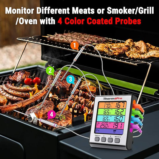 ThermoPro TP17H Digital Meat Thermometer with 4 Temperature Probes, HI/LOW Alarm Smoker Food Thermometer with Colored Backlit LCD, BBQ Thermometer for Cooking Grilling Kitchen Oven Barbecue Turkey