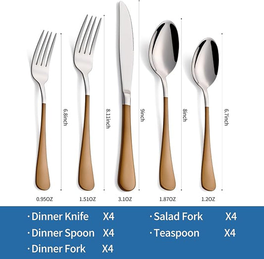 20-Piece Coffee Color Silverware Set 18/0 Stainless Steel Coffee Color Handle Flatware Set Service for 4 Modern Cutlery Set Includes Dinner Knives Forks Spoons, Mirror Polished Dishwasher Safe