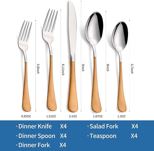 20-Piece yellow Silverware Set, 18/0 Stainless Steel yellow Handle Flatware Set, Service for 4, Modern Cutlery Set Includes Dinner Knives Forks Spoons, Mirror Polished, Dishwasher Safe