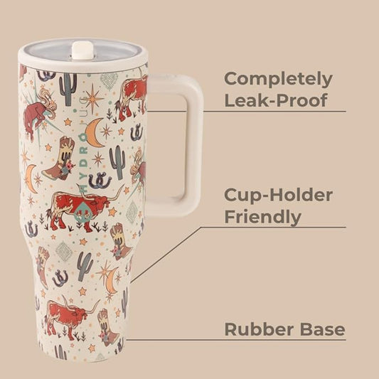 HydroJug Traveler - 40 oz Water Bottle with Handle & Flip Straw - Fits in Cup Holder, Leak Resistant Tumbler-Reusable Insulated Stainless Steel & Rubber Base - Gifts for Women & Men, Rodeo