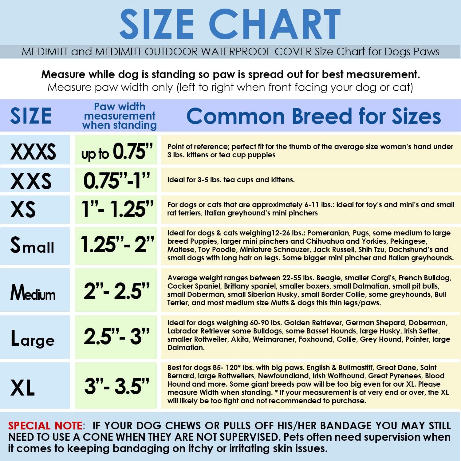 - XS – paw width measurement when standing: between 1”- 1.25. For dogs or cats approximately 6-11 lbs.: ideal for toy’s and mini’s and small rat terriers, Italian greyhound’s mini pinchers IF YOUR DOG CHEWS OR PULLS OFF HIS/HER BANDAGE YOU MAY STILL NEED TO USE A CONE WHEN THEY ARE NOT SUPERVISED. Pets often need supervision when it comes to keeping bandaging on itchy or irritating skin issues.