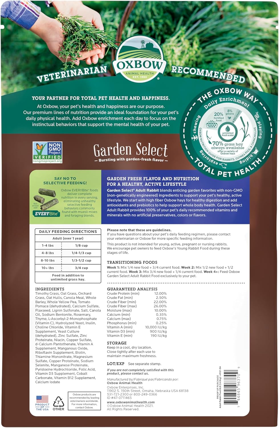 - NON-GMO: Oxbow Garden Select Adult Rabbit Food is made with non-GMO ingredients you can trust; These rabbit and bunny pellets provide a natural, unaltered diet that supports your petβs health while meeting the highest standards of quality and care