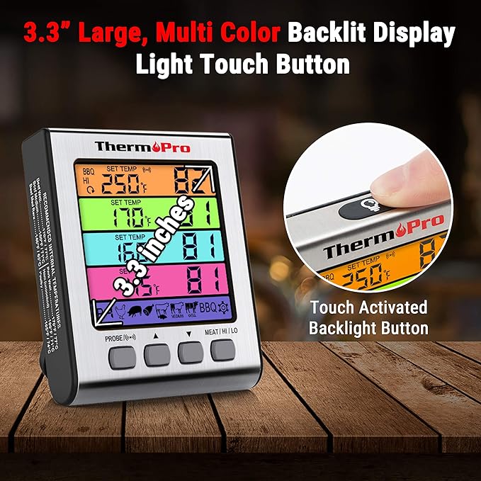 - Multi Color backlit display and 4 color-coated probes: Meat probe thermometer for cooking has a one of a kind, large 3.3 inch multi colored backlit and 4 colored probes to let you monitor multiple pieces of meat or your BBQ temp without confusion