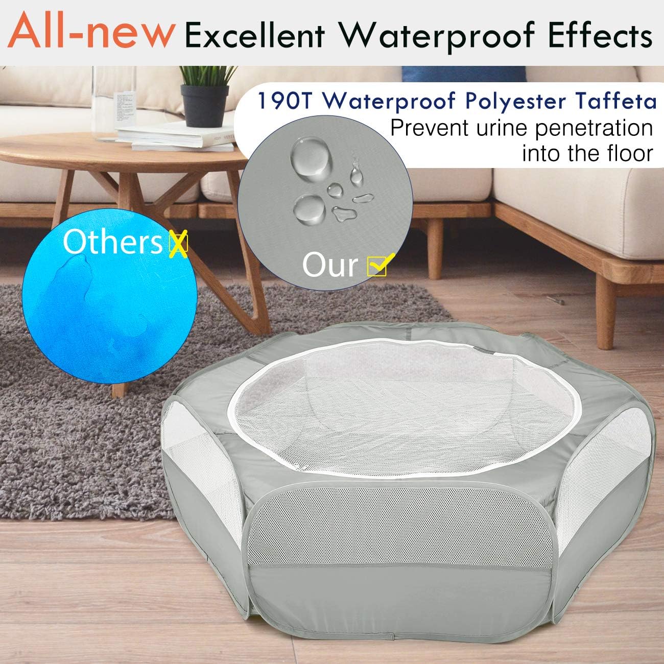- γ NO MESS - WATERPROOF DESIGN γοΌ190T Waterproof Polyester Taffeta with the bottom of the playpen, effectively prevents urine penetration into the floor. The top mesh with a dual-zippered opening is easy to clean and allows power cords to pass through. (NOTE: For your small pet animals' health, please clean up the water stain in time.)