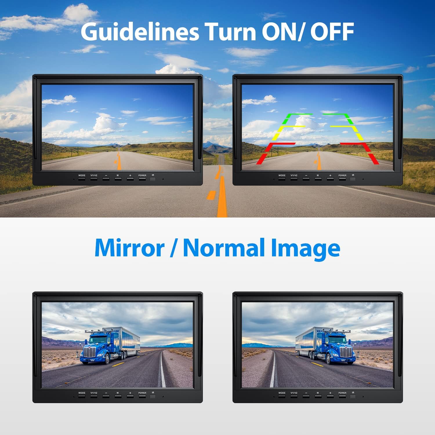 - ๐Split Screen and Parking Guidelines: This monitor will display up to 4 cameras simultaneously or individually for bigger image, no more blind spots. With the parking guidelines, it can help you to judge the distance between your car and the object around it, which can make your parking safer and easier. What's more, you can change the image to front view or rear view, so you can use one of the camera as the front view camera. Monitor dimension: 9.84 inch(L)*6.46 inch(H)