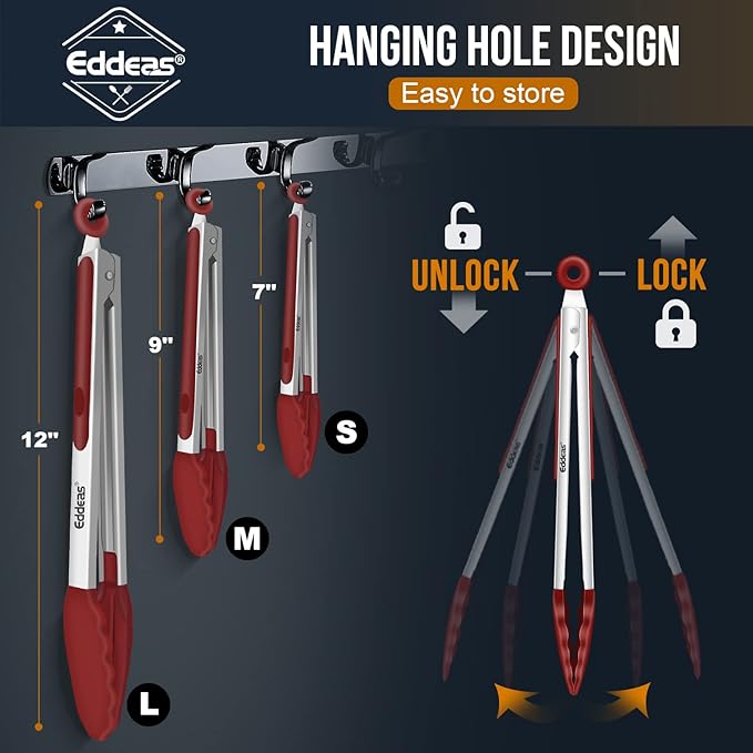 - LOCKING MECHANISM & PULL-RING TECHNOLOGY -EDDEAS ring-pull technology will keep your tongs from opening and closing accidentally which will allow you to facilitate better control while using them. And can be conveniently dried and stored.The set of 3 sizes - Small 7", Medium 9", Large 12" is perfect for all your needs.