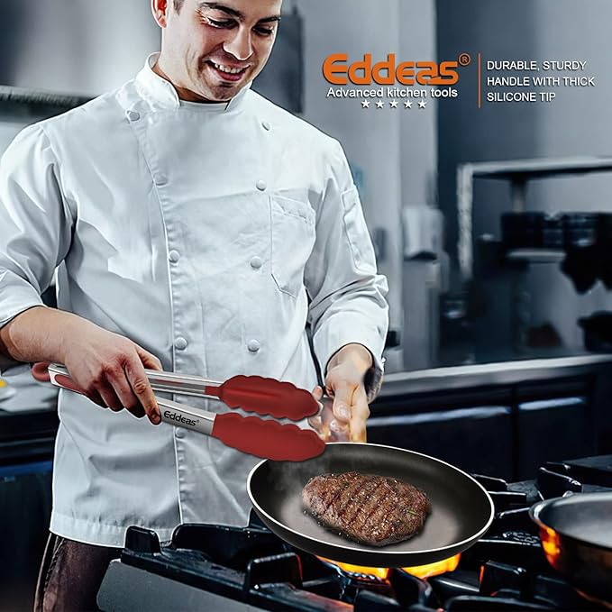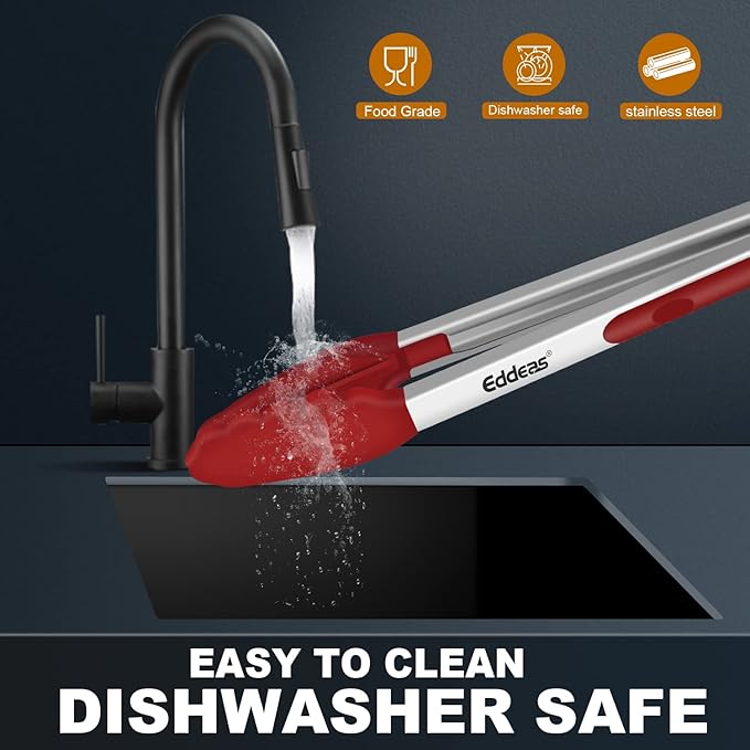 - EDDEAS NON STICK SILICONE TIP, Silicone KitchenTongs for Cooking won't MELT, RUST OR FLAKE-The tip is made of food-grade silicone, which is safety-tested, heat resistant up to 480°F . Food tongs with non-stick silicone tips protect your cookware from damage, easy to clean and dishwasher safe.