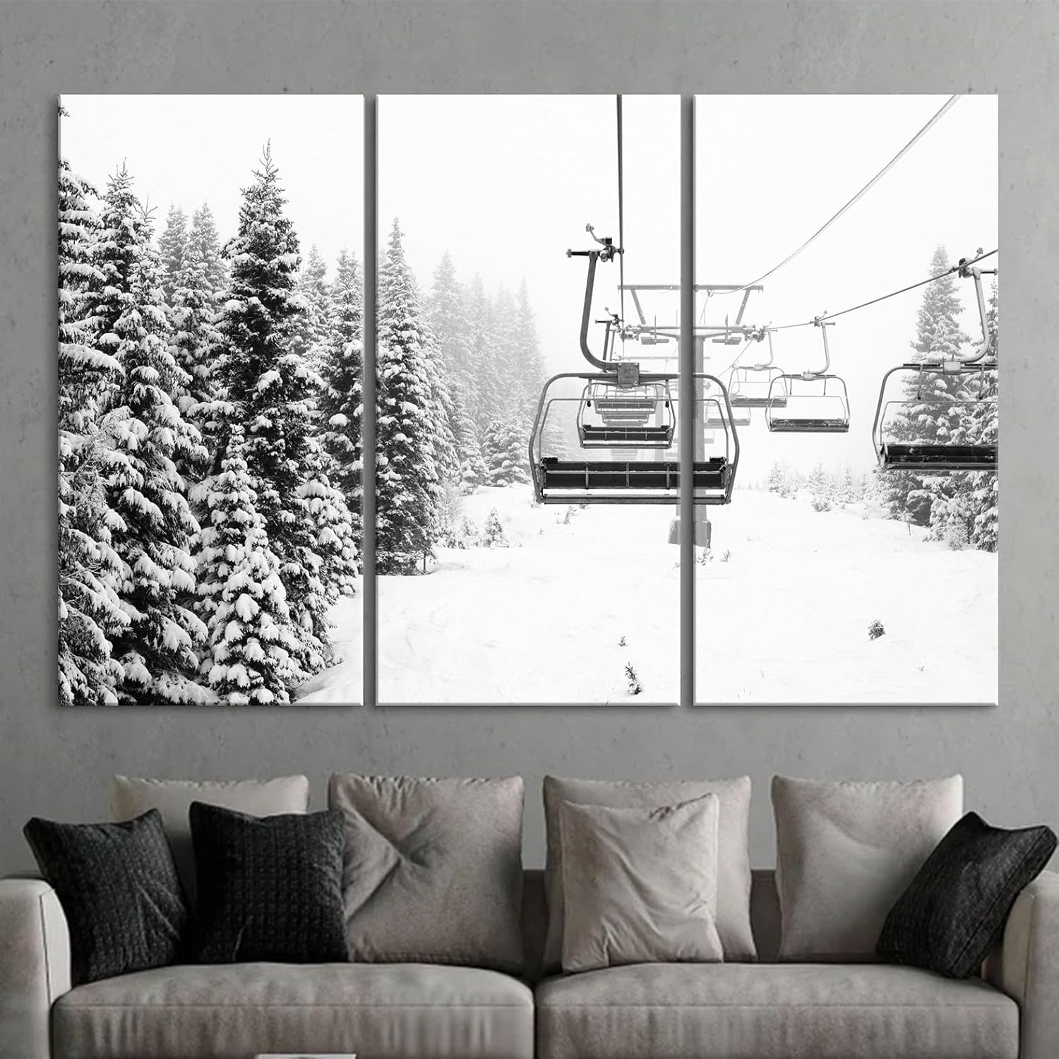 Nature Wall Art Prints - Ocean Forest Mountain Lake Canvas Landscapes - Small to Extra Large Living Room Bedroom Kitchen Bathroom Décor (Ski Lift on Snowy Mountain, 39L" x 59W" - 3 Panels)