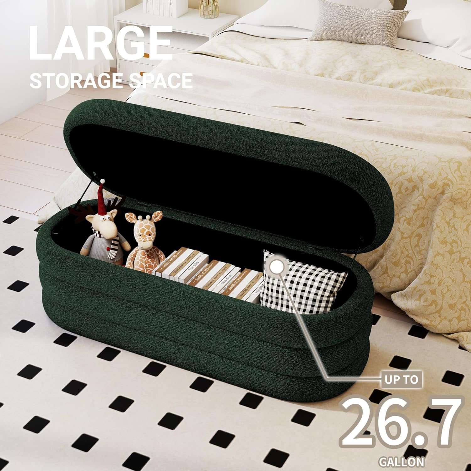 - Versatile Usage : This large storage bench is suitable for bedrooms, living rooms, and entryways. It effortlessly blends into various decorative styles, adding practicality and beauty to your space.
