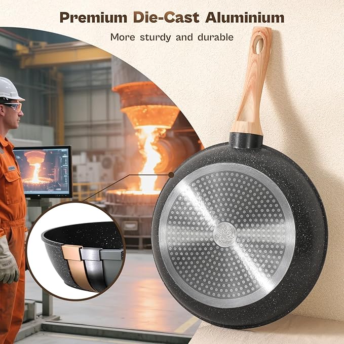 - Die-Cast Aluminum Construction – Engineered for even heat distribution and long-lasting durability, each piece is crafted from premium die-cast aluminum that heats up quickly and cooks food evenly—eliminating hot spots and ensuring consistent results.