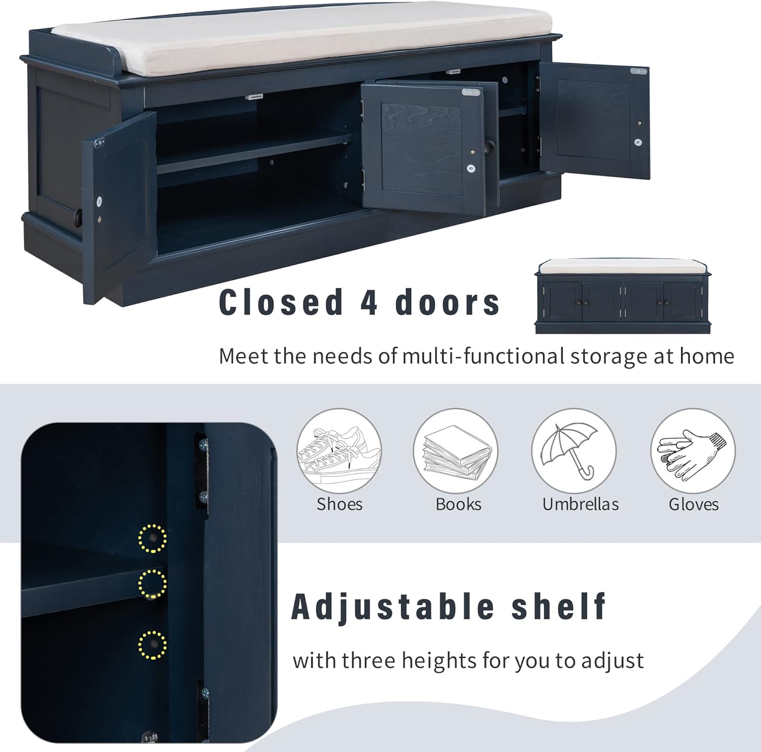 Storage Bench with 4 Doors and Adjustable Shelves, Shoe Bench with Removable Cushion for Living Room, Entryway 42.7" L x 16" W x 17.4" H (Antique Navy)