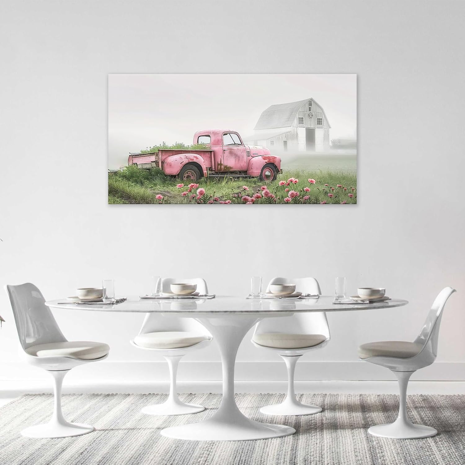 Large Rustic Farmhouse Pink Truck Wall Art for Living Room Country Barn Art Big Space Size Bedroom Office Framed Canvas Prints Pictures Painting Artwork Office Bedroom Home Decor 60"x30"