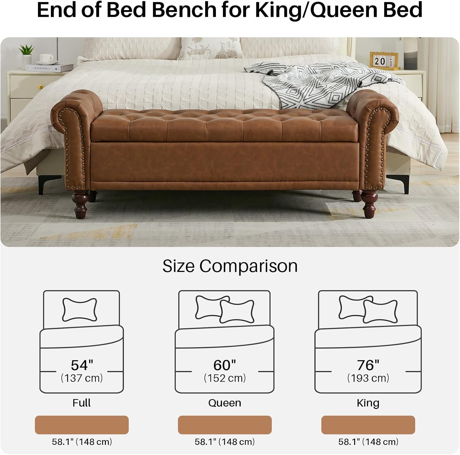 - EASY ASSEMBLY: The This storage bed bench overall size is 58.1" W x 18.7"D x 20.8" H. The cushioned bench is pre-assembled 80% and will come with a manual and installation tools to assemble it, it's simple and convenient.