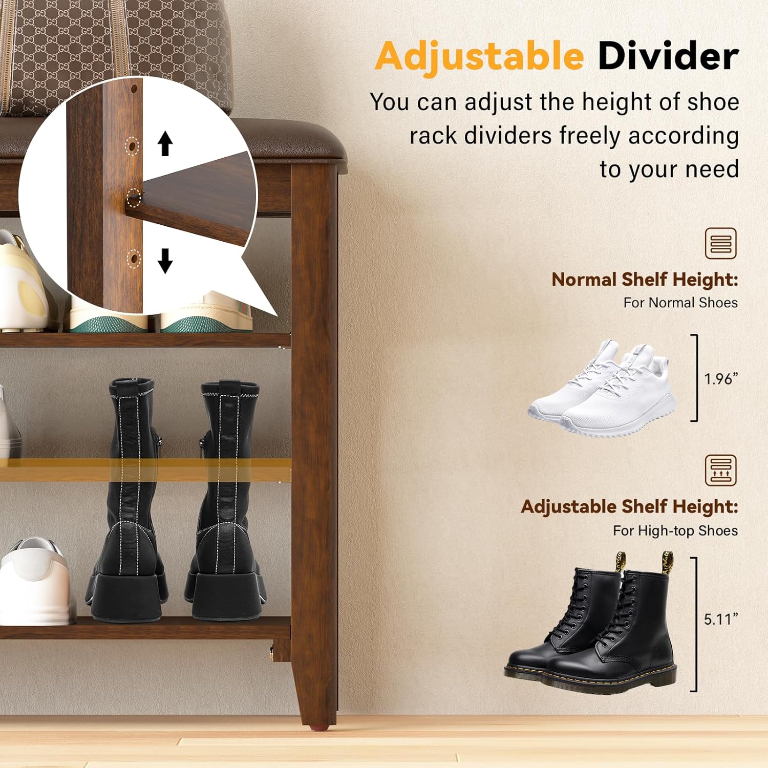Entryway Shoe Storage Bench with Leather Cushion, Shoe Organizer Bench for Entryway, Ideal for Hallways Front Doors Entrances Mudrooms Featuring Rubberwood And 3 Height-Adjustable and Removable Shelve