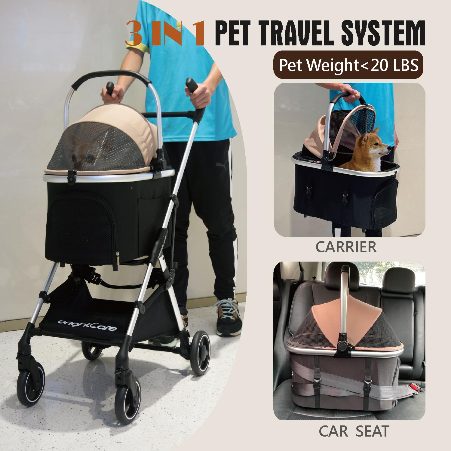 3-in-1 Small Pet Carrier with Stroller for Small Dogs & Cats Under 20 lb – Removable Carrier Converts to Car Seat – Lightweight, One-Hand Fold, No-Zipper Entry
