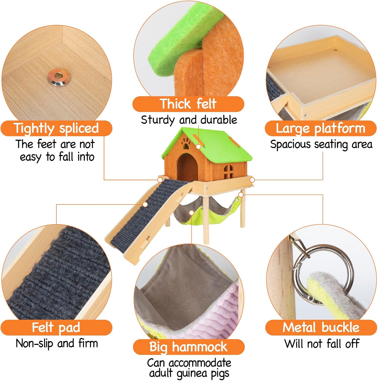 - 【3 IN 1 MULTIFUNCTIONAL DESIGN】Hammock+Platform+House.This guinea pig toys uniquely combines a hammock,platform and house together to provide your piggies with multiple ways to move around.The perfect blend of hiding,sleeping and playing can promote a happy and healthy lifestyle for your piggy.Effectively saves the space in guinea pig cage and cost of guinea pig accessories.