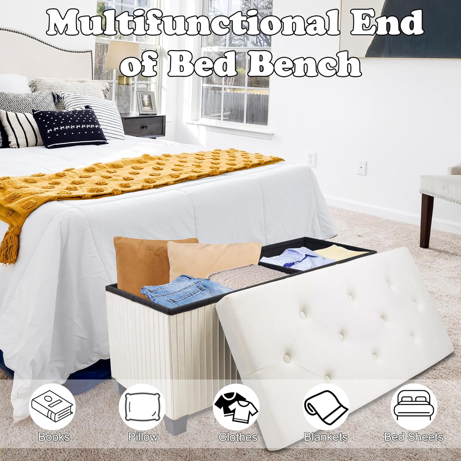 - Easy to Set Up and Fold: Measuring 43.3" L x 15.7" W x 15.7" H. Unfold, insert the bottom panel, connect the feet, and your folding storage bench is set for use. When not in use, it folds effortlessly, saving valuable space in your home.