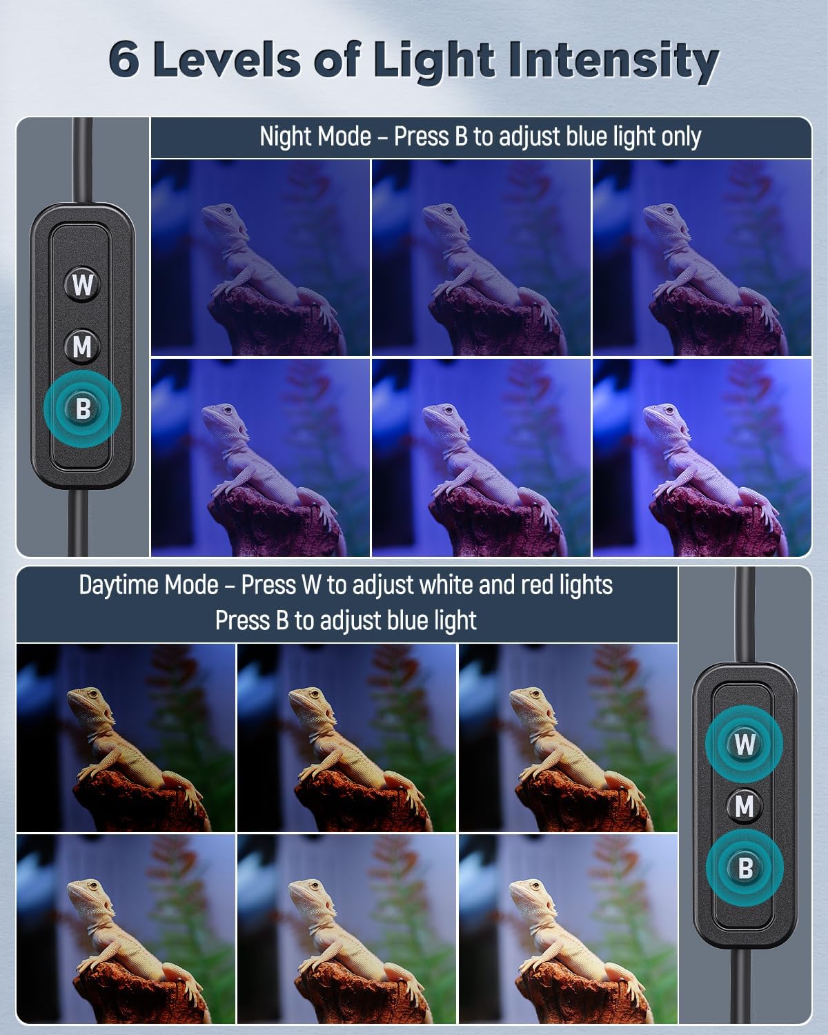 - 2 Lighting Modes: Short press the M button repeatedly to switch between daytime and night modes. Hold the M button for 3 seconds to turn all lights off. Simulate natural sunrise and sunset to energize your reptiles and give them a sound sleep