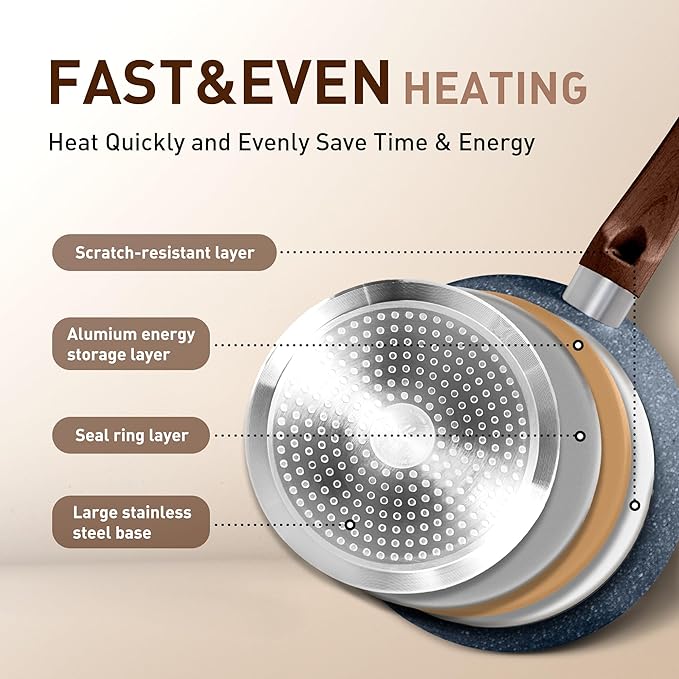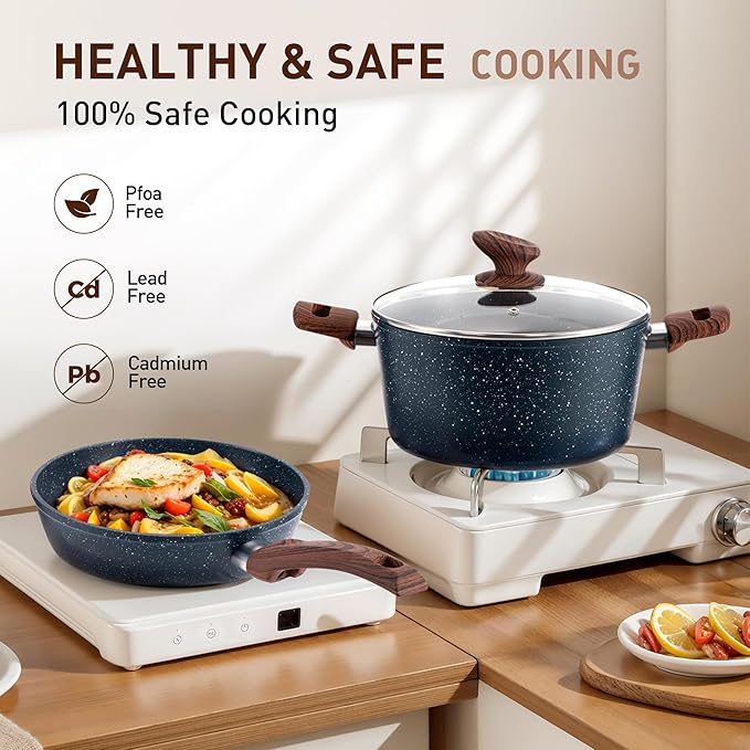 - ๐๐ก๐จ๐ฎ๐ ๐ก๐ญ๐๐ฎ๐ฅ ๐๐๐ฌ๐ข๐ ๐ง ๐๐จ๐ซ ๐๐ซ๐๐๐ญ๐ข๐๐๐ฅ๐ข๐ญ๐ฒ: Anti-scald handles keep your hands safe, while the deeper pan shape allows for versatile cooking techniques, from stir-frying to simmering. Versatile cookware set for various cooking methods