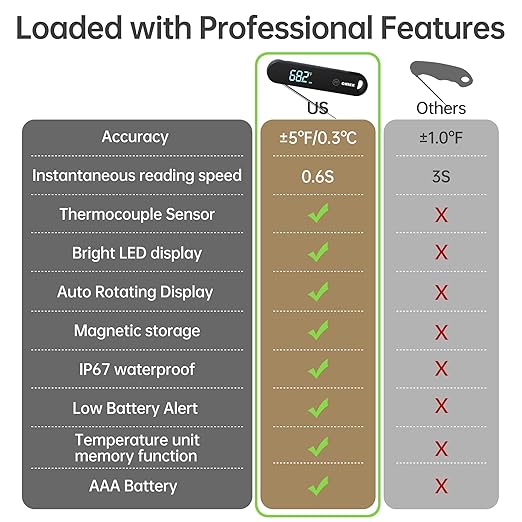 - Easier to Use: The automatically rotating LED display supports left- and right-handed use. Pressing the “Hold” button locks the current temperature reading, ensuring a comfortable and intuitive cooking experience.