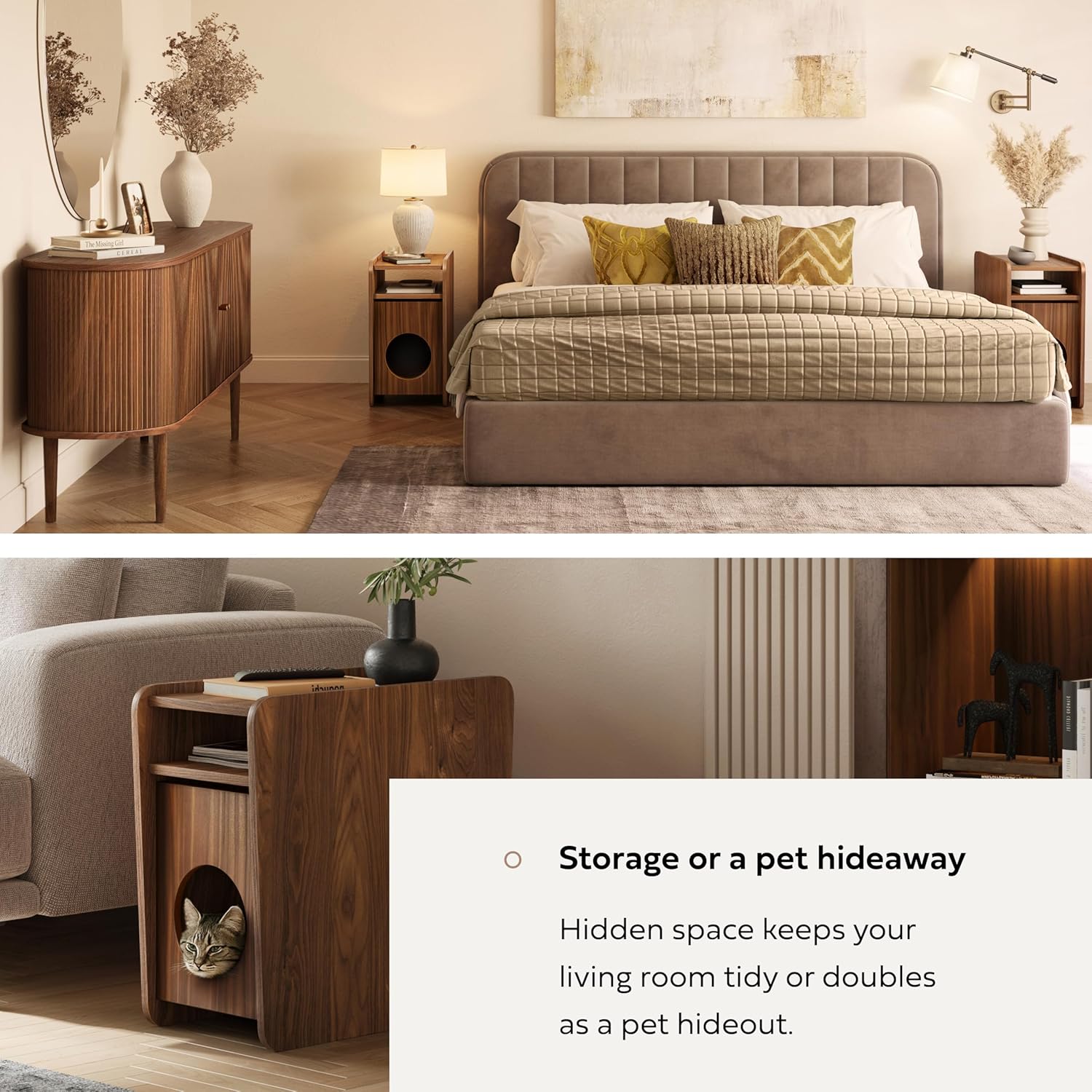 - ENJOY EFFORTLESS STORAGE with this walnut end table, featuring a sleek shelf, built-in magazine holder, and a storage compartment that doubles as a cozy hideaway for small pets. Compact yet functional, this small wooden side table (width 11.8'' x height 22.2’’ x depth 23.5’’) offers smart storage for your favourite books, magazines, remotes and chargers. Place the chair side table either way — magazine holder or storage side in front.