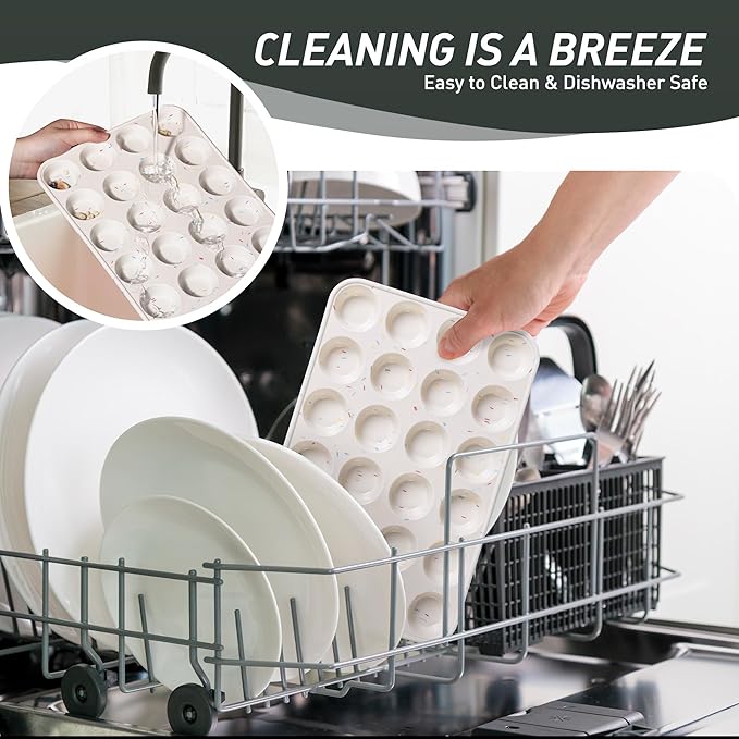 - Effortless Release Every Time: The baking cupcake muffin pans features a smooth, nonstick surface that releases baked goods with just a gentle push from the bottom - no messy greasing or stubborn sticking. After baking, simply place the entire baking cupcake muffin pans in the dishwasher for effortless cleaning. Compared to traditional metal baking cupcake muffin pans, our high-quality silicone material resists oil absorption, reducing residue buildup by 85% for quicker, simpler cleanup.