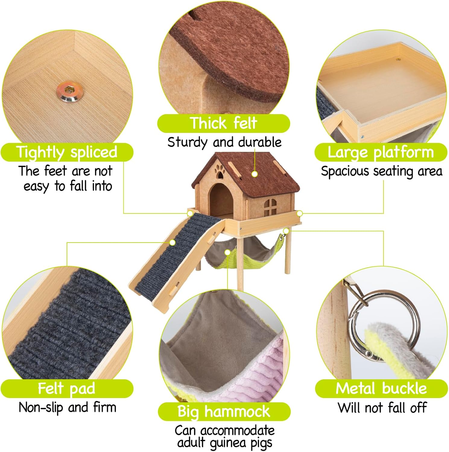 - 【3 IN 1 MULTIFUNCTIONAL DESIGN】Hammock+Platform+House.This guinea pig toys uniquely combines a hammock,platform and house together to provide your piggies with multiple ways to move around.The perfect blend of hiding,sleeping and playing can promote a happy and healthy lifestyle for your piggy.Effectively saves the space in guinea pig cage and cost of guinea pig accessories.