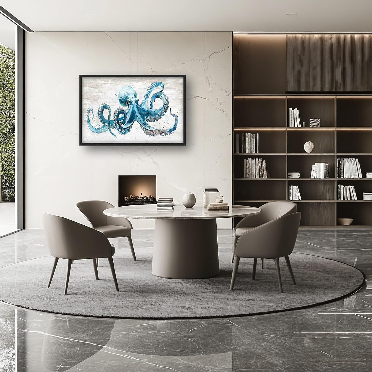 - 【Unique Design】A beautiful watercolor painting of an octopus with large tentacles, in light blue and white tones on a wooden background, with high detail and high resolution.