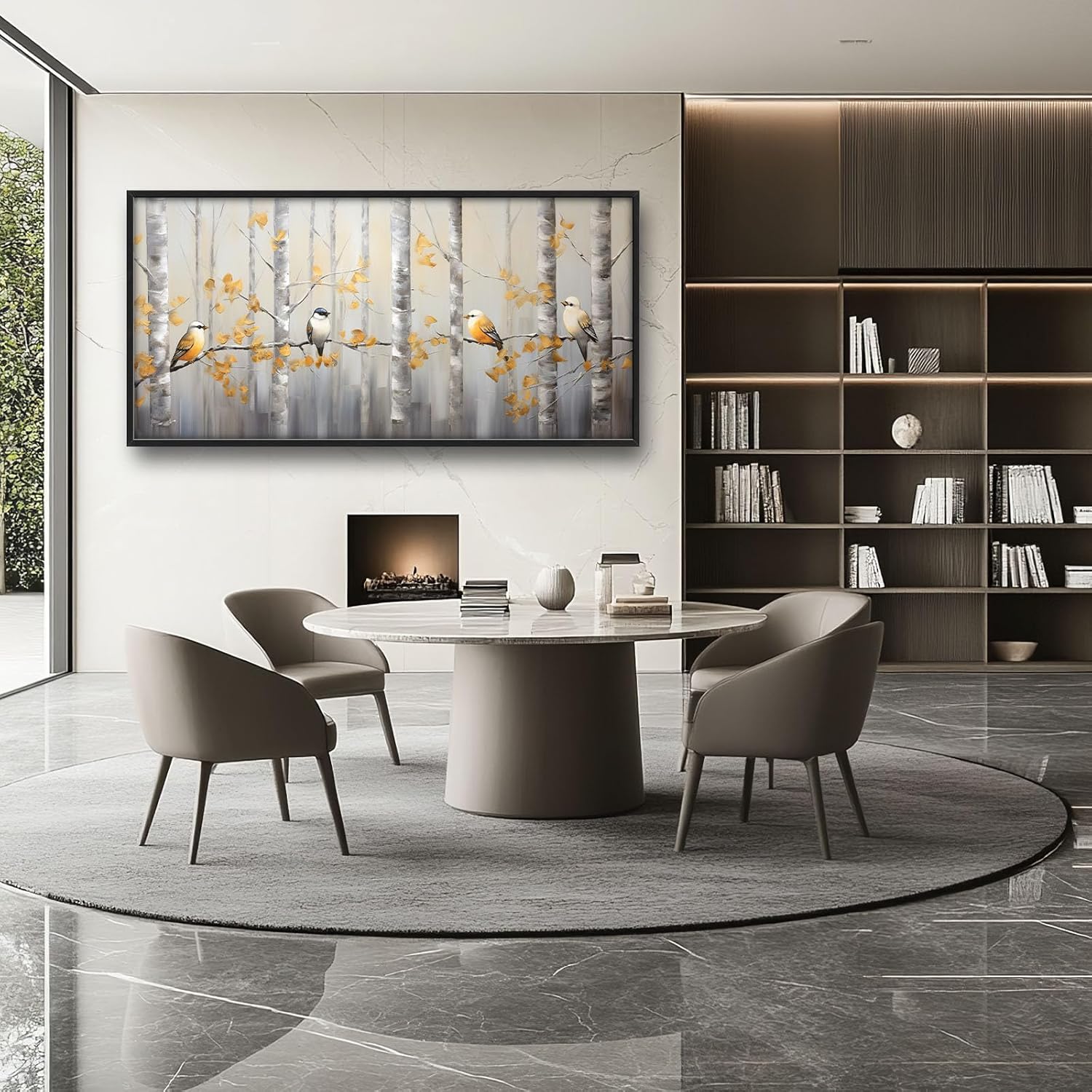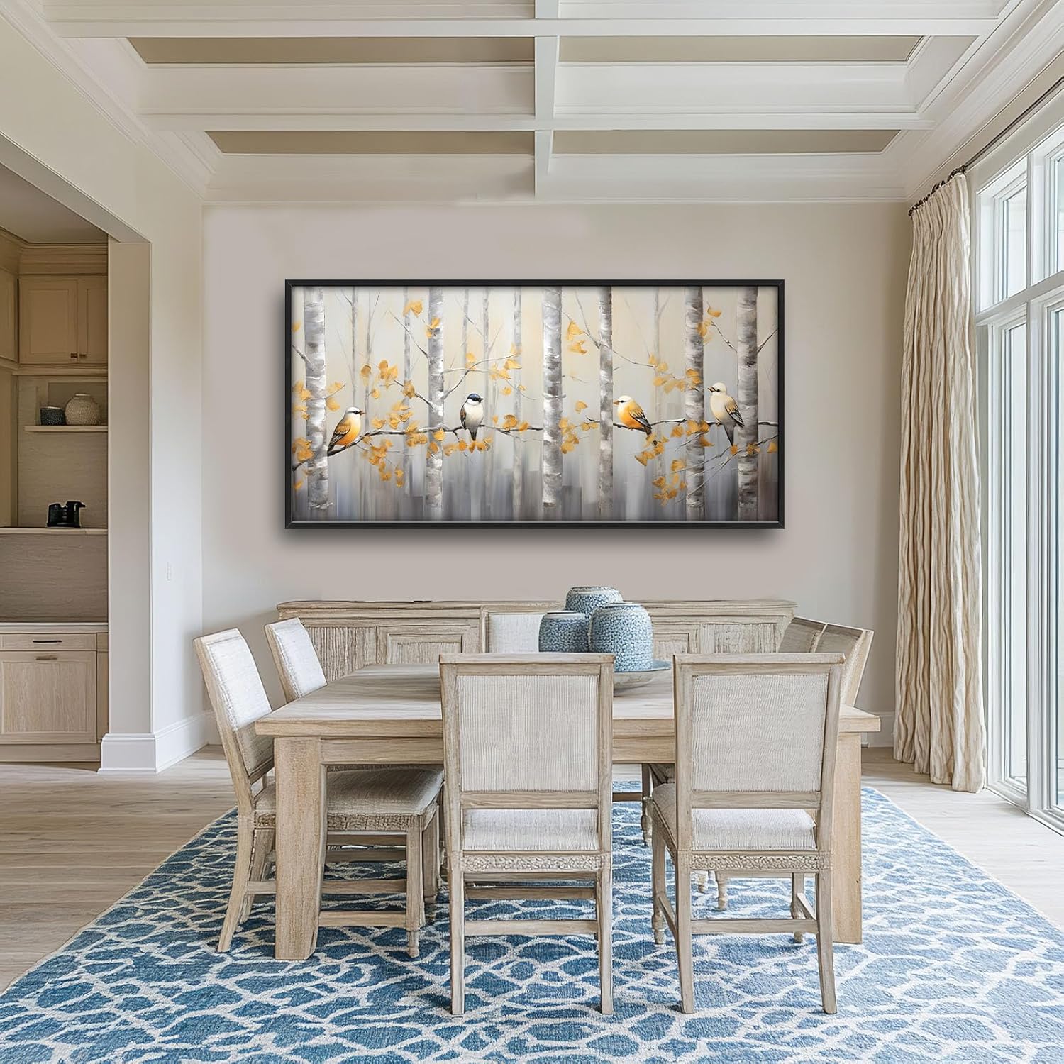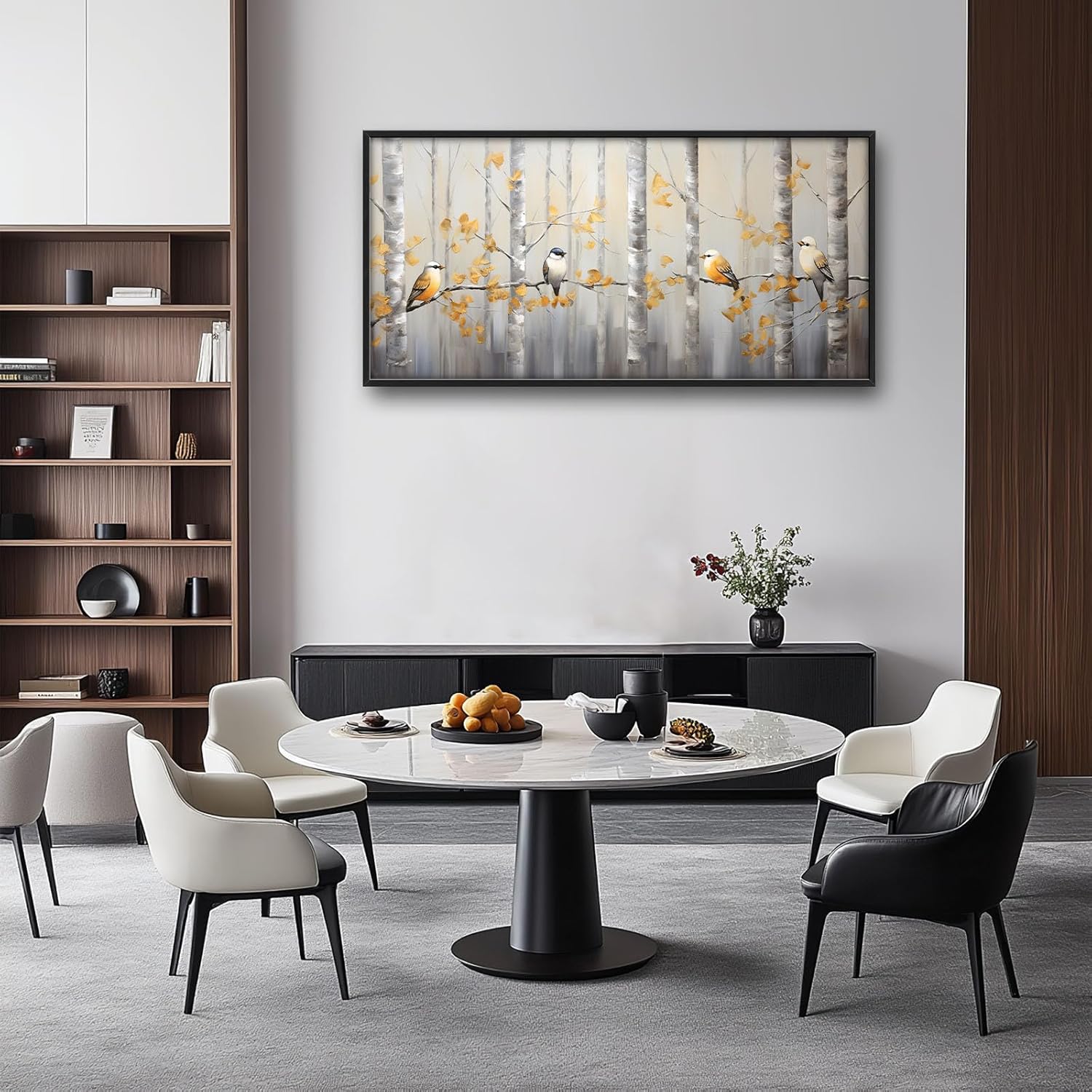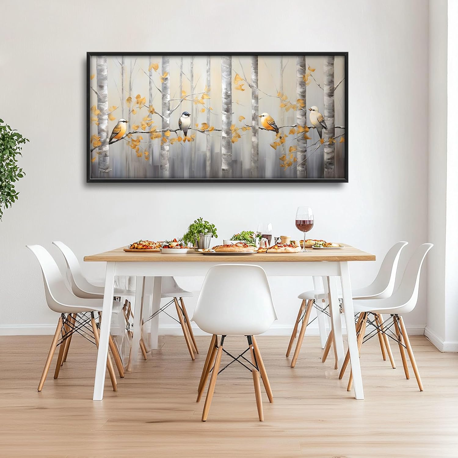 - 【Unique Design】Abstract painting of silver birch trees with birds, yellow leaves, white background, gold accents, soft lighting, neutral tones, modern style, wide frame, oil on canvas, brush strokes, elegant composition, nature-inspired artwork.