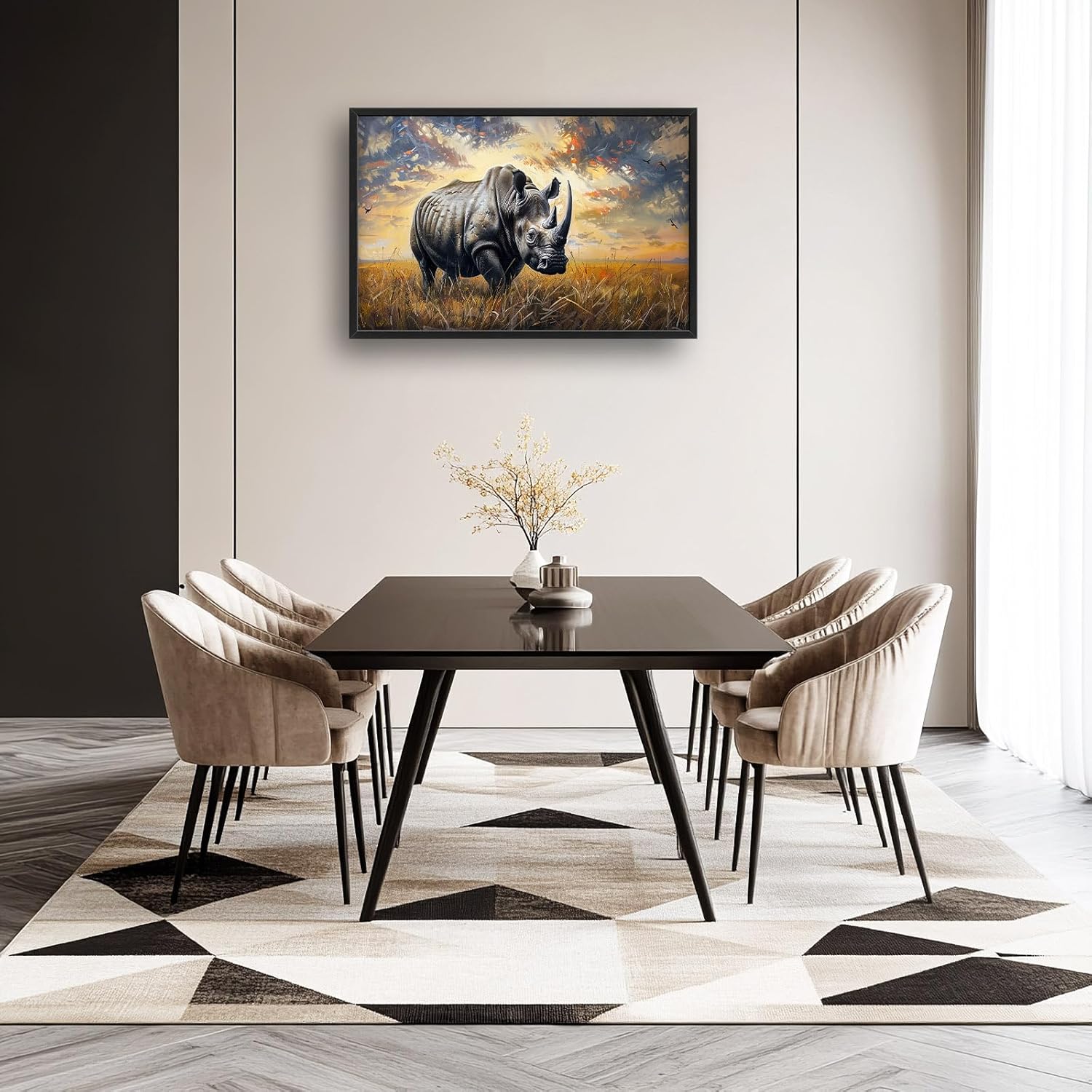 - 【Unique Design】A majestic rhinoceros stands tall in the savannah, with its powerful horns and thick skin, against a backdrop of golden grasslands under a dramatic sky. The painting captures the essence of wildlife beauty, emphasizing details like intricate fur patterns on its body and expressive facial features.