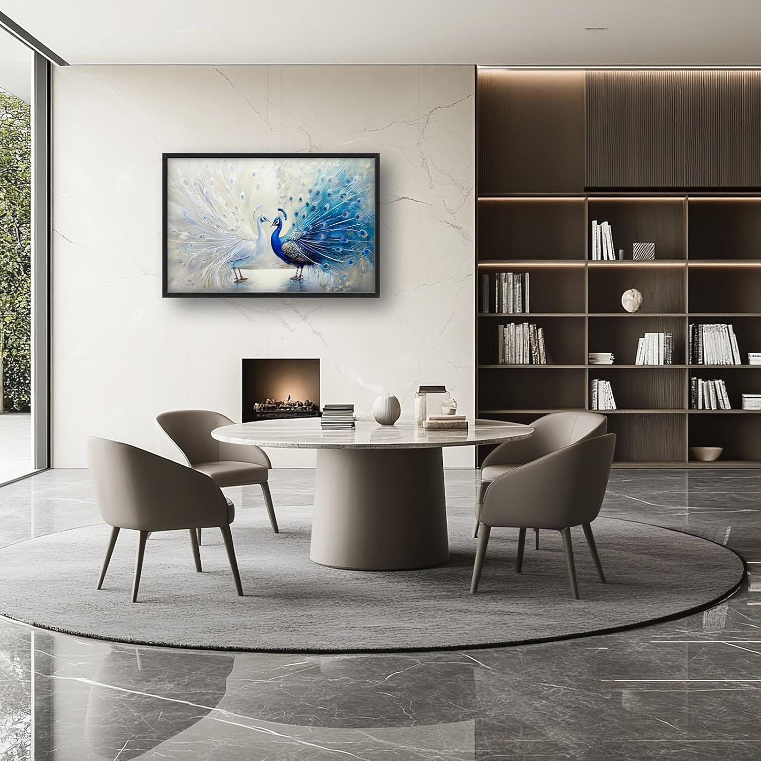 - 【Unique Design】Blue and white peacock painting, oil on canvas, two beautiful peacocks with long tails, white feathers spread out in the background, exquisite feather details, elegant posture, gorgeous colors, symmetrical composition, soft lighting, and romantic atmosphere. The background is blurred to highlight the theme of the peafowl.