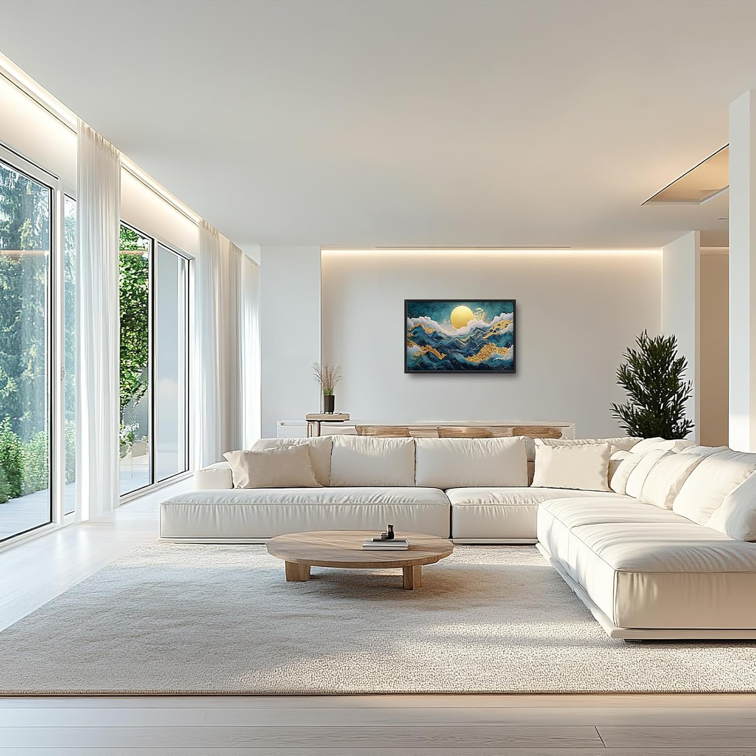 Framed Large Sun Mountain Wall Art, Oversized Teal and Golden Sun Wall Decor for Living Room, Abstract Landscape Canvas Painting Modern Artwork Home Decoration for Living Room Bedroom 36"x24"
