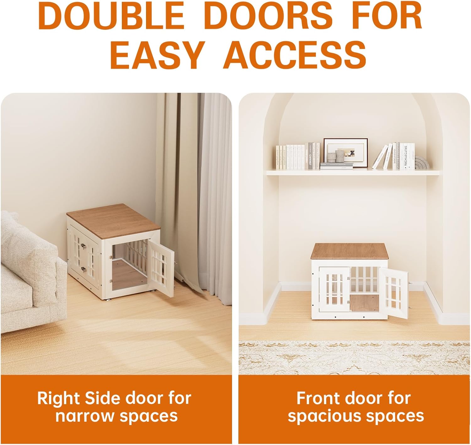 - 【Double Doors Design】The dog kennel furniture has a front door and a side door, your pet will go in and out easily with double doors. The double-doors design can adapt to more different space environments. You can decide whether to open the front door or the side door according to your needs.