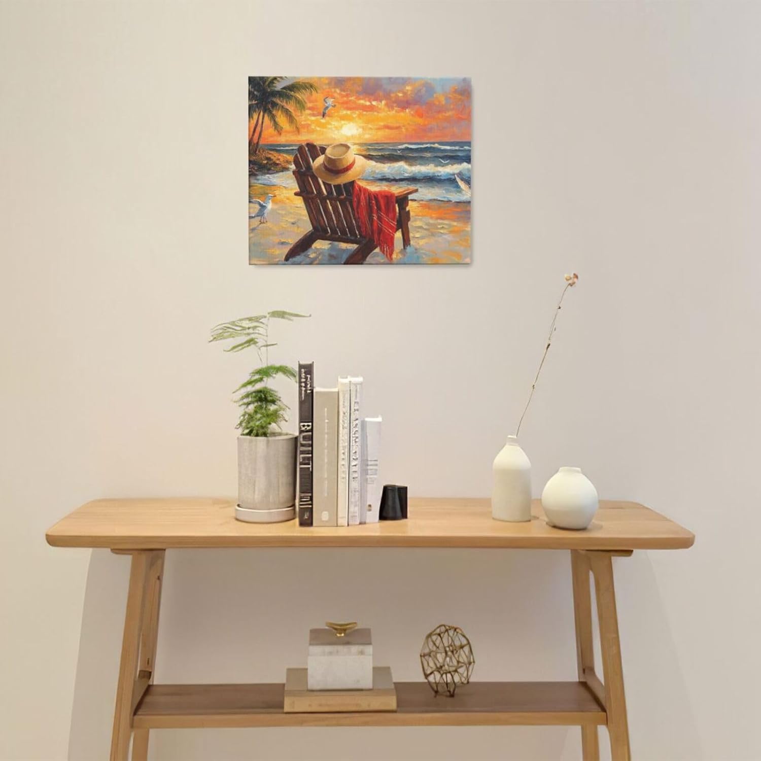 Beach Coastal Bathroom Pictures Wall Art, Seaside Ocean Bathroom Wall Decor, Sunrise Palm Framed Painting Canvas Artwork for Bedroom Living Room Decorations 24"L x 20"W