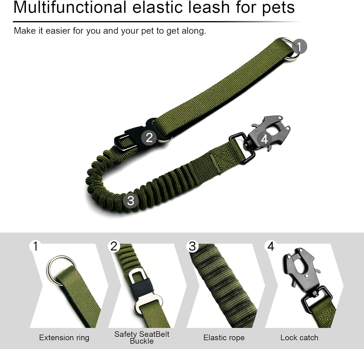 20” Strong Short Leash for Dog, Heavy Duty Bungee Dogs Leash with Padded Handle Car Seatbelt, Dog Training Leashs for Large or Medium Dogs - Can be Used with Other leashes (Army Green)