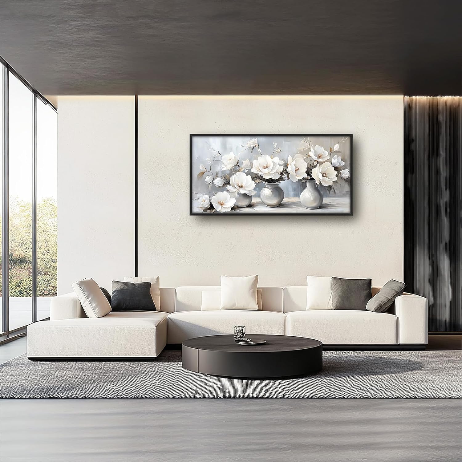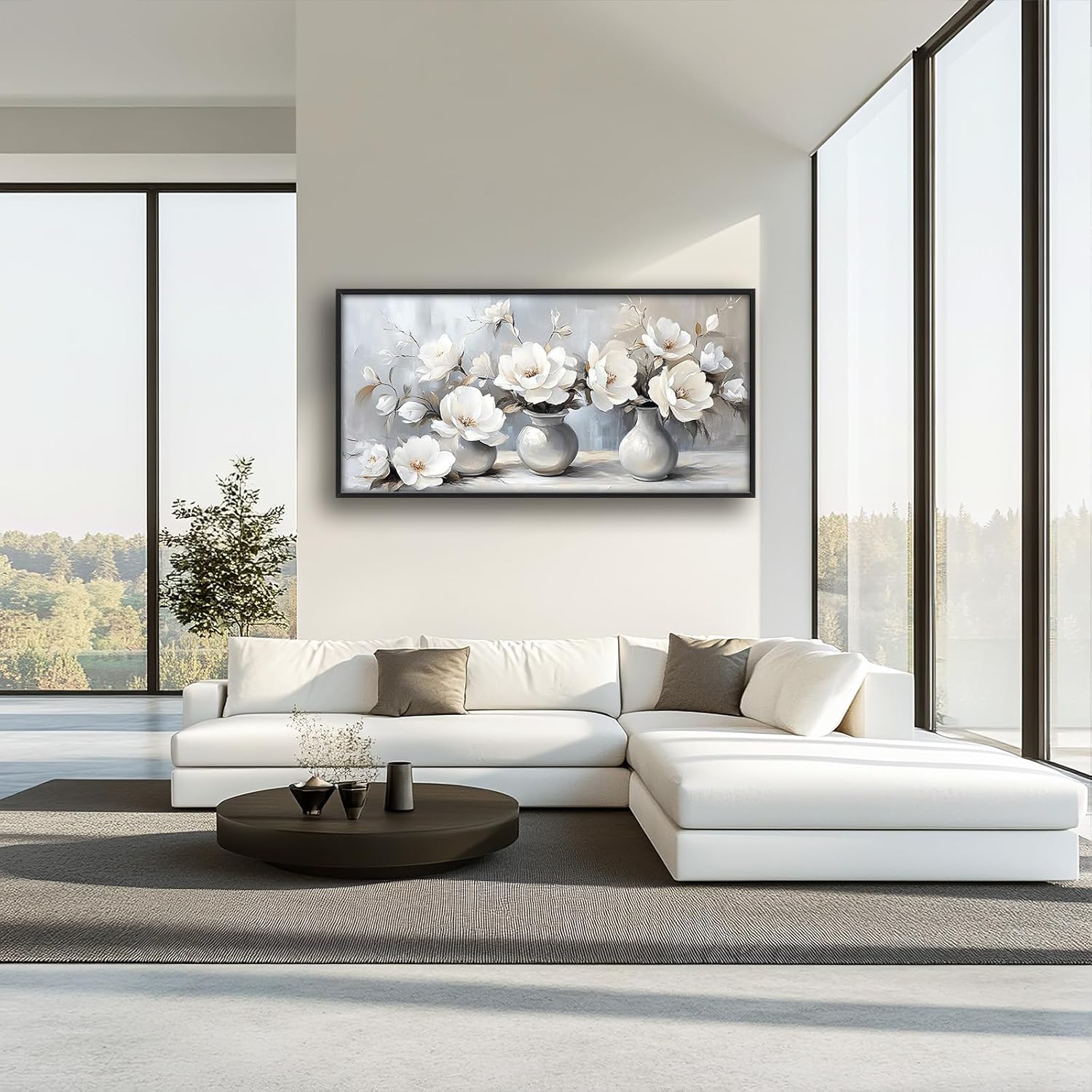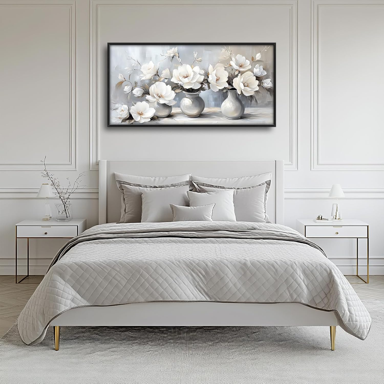 Large Farmhouse Floral Wall Art for Living Room, Framed Oversized White Flower Vase Wall Decor Grey Floral Canvas Painting Pictures Modern Artwork for Bathroom Bedroom Office Dining Room 60"x30"