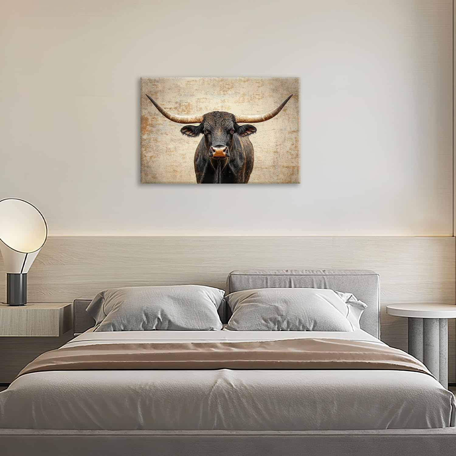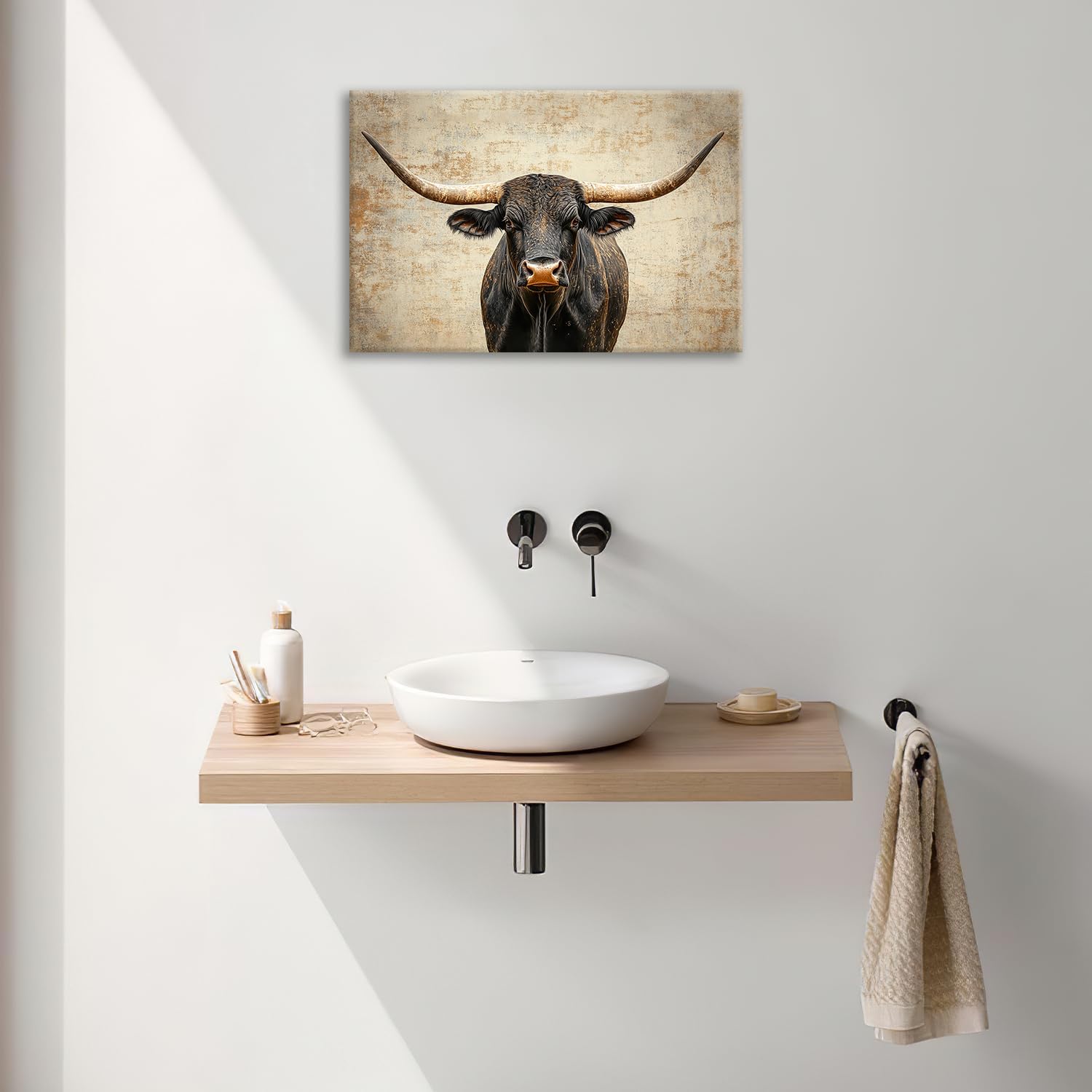 Rustic Highland Cow Pictures Wall Art, Farmhouse Longhorn Bull Bathroom Wall Decor Black Cow Framed Painting Canvas Artwork for Bathroom Bedroom Living Room Decorations 24"L x 16"W