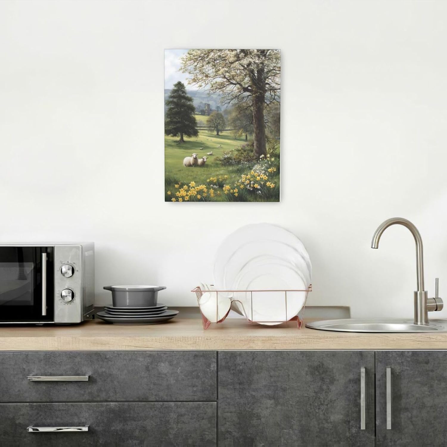 Country Sheep Canvas Wall Decor Farmhouse Rustic Lamb Wildflower Wall Art Nature Countryside Landscape Pictures Painting Print Framed Artwork Decorations for Bathroom Living Room Bedroom 12"x16"