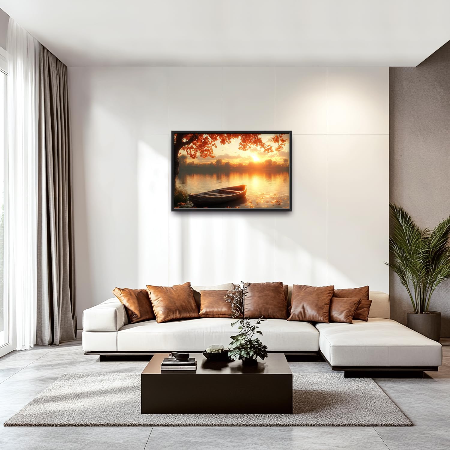 Large Lake Sunrise Landscape Wall Art for Living Room, Nature Boat Canvas Oversized Wall Decor, River Scenery Framed Pictures Painting Print Artwork for Bedroom Office 36"L x 24"W