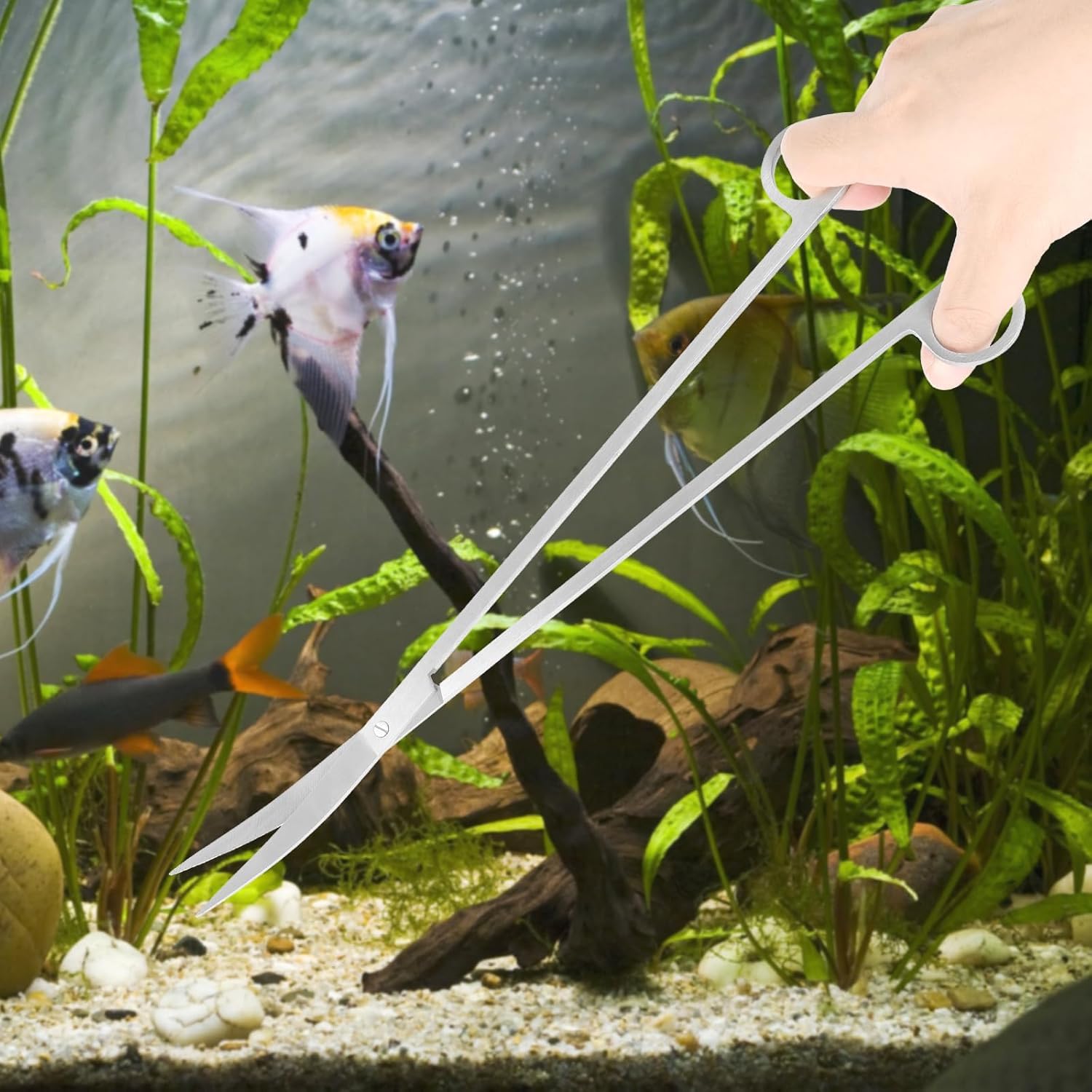 - 【Extra Long Design】This comprehensive aquarium aquascape tool kit includes 1 curved scissors (13.8in), 1 straight tweezers (15in), 1 curved tweezers (15in), and 1 sand spatula (15.3in). Perfect for regular maintenance tasks such as feeding, trimming, planting, and adding fish tank accessories with ease.