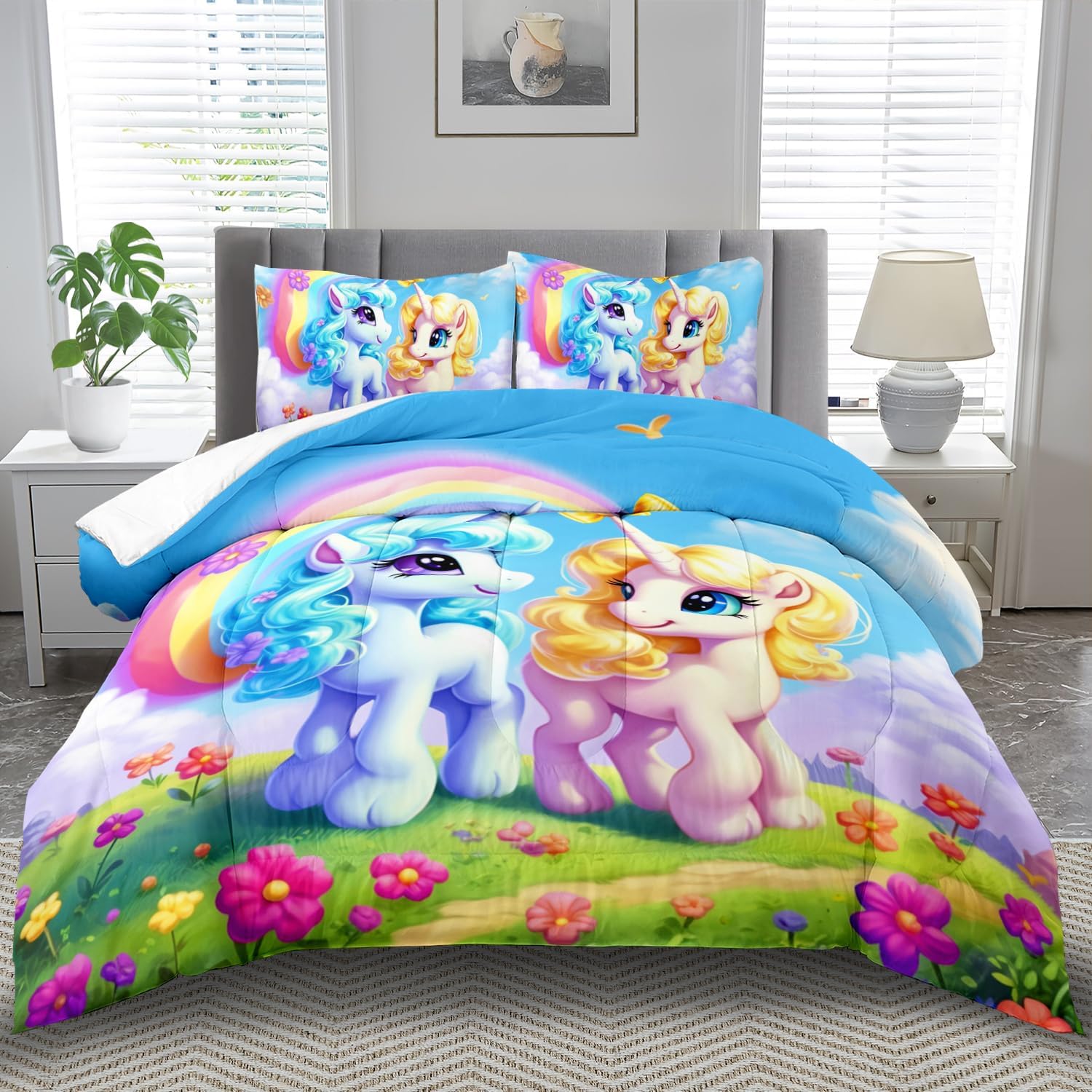 Unicorn Comforter Set Twin,Kawaii Unicorn Bedding Set Twin Kids,Rainbow Comforter Blue Bedroom Decor,Cute Animal Bedding Rainbow Bed Decor for Girls,Cartoon Blue Floral Quilt